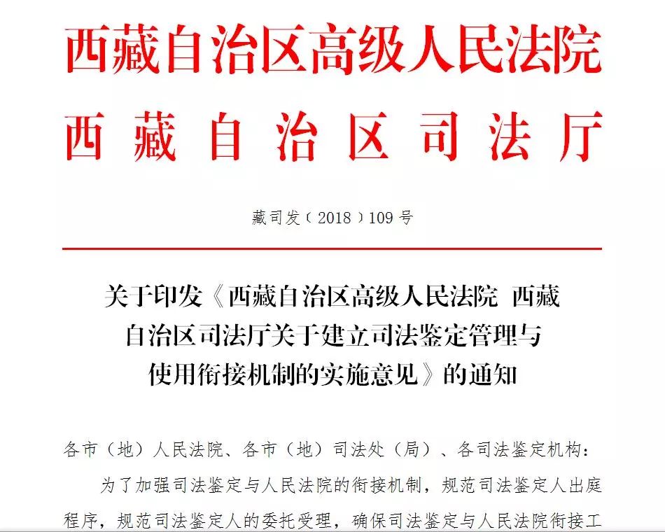 西藏自治区高级人民法院,区司法厅联合印发《关于建立司法鉴定管理与使用衔接机制的实施意见》(附全文)