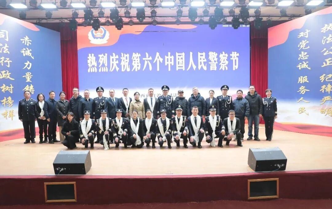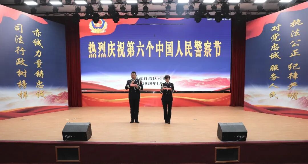 在第六个“中国人民警察节”来临之际,为进一步凝聚警心、鼓舞士气,彰显司法行政干警队伍的忠诚担当,1月9日,自治区司法厅紧扣“对党忠诚、服务人民、执法公正、纪律严明”总要求,以“司法行政树榜样,赤诚力量铸忠诚”为主题,开展奏唱国歌、表彰先进典型、颁授“从警30年”荣誉、新警授衔、文艺表演等系列活动,隆重庆祝“中国人民警察节”。本次活动表彰了10名在2025年工作中立足本职、扎根基层、服务群众、促进社会治理的优秀司法行政干警,授予“最美司法行政干警”荣誉称号,并通过宣传片和事迹分享,多角度展现他们在平凡岗位上默默坚守和无私奉献的感人故事。活动中,厅系统干部民警职工通过舞蹈、弹唱、朗诵、警体技能等方式,集中展现了司法行政干警良好的综合素养和昂扬向上的精神面貌。厅党委向全体干部民警及家属送上节日问候,并号召全区司法行政干警以“最美”为榜样,见贤思齐、比学赶超,在全区司法行政系统掀起学习先进、争当先进的热潮,为全面依法治藏、长治久安和高质量发展作出司法贡献、尽到司法责任!在家厅领导,自治区党委组织部、自治区党委宣传部、区直机关工委、自治区党委政法委、自治区高级人民法院、自治区人民检察院、自治区公安厅、自治区纪委监委驻自治区党委政法委机关纪检监察组、拉萨市城关区夺底街道桑伊社区等有关领导出席;厅机关全体干部职工、老干部代表、驻拉萨各直属单位主要负责人及干警代表参加活动。