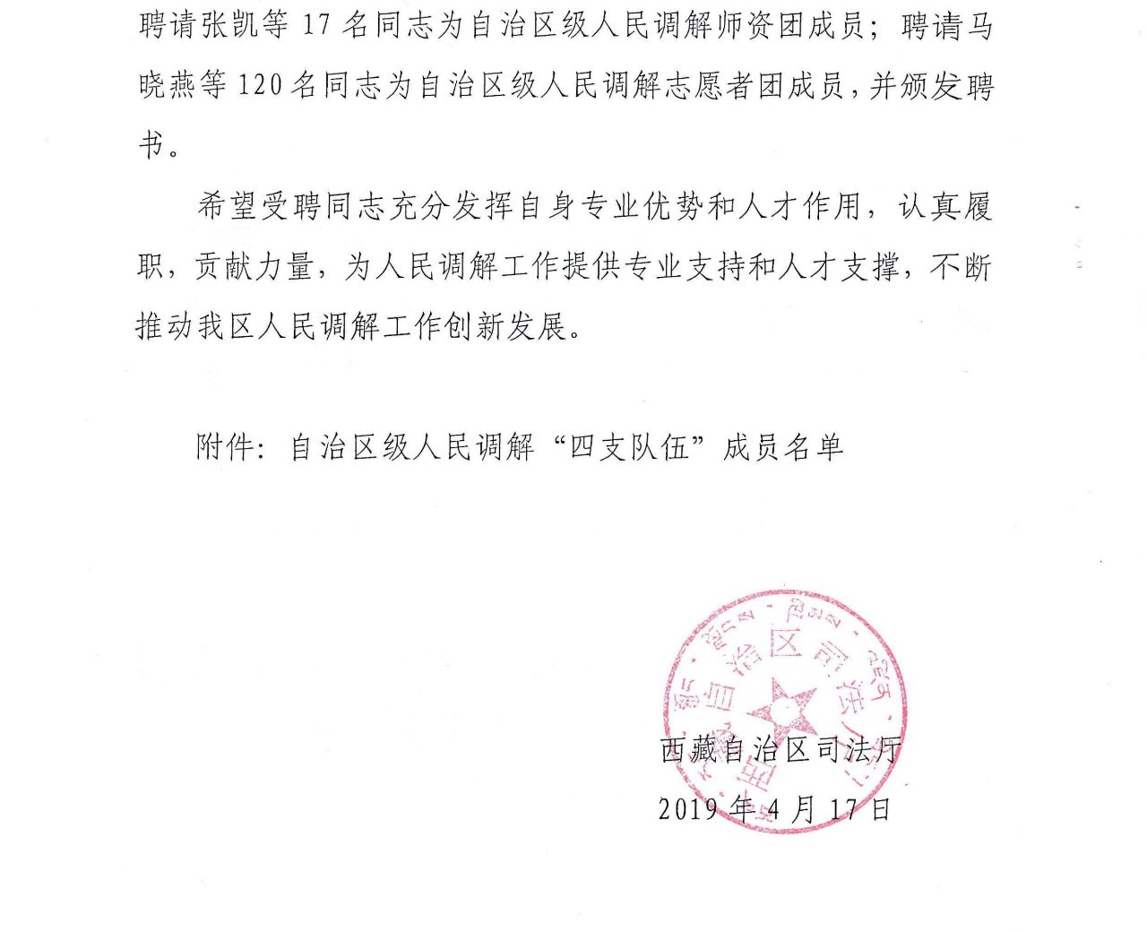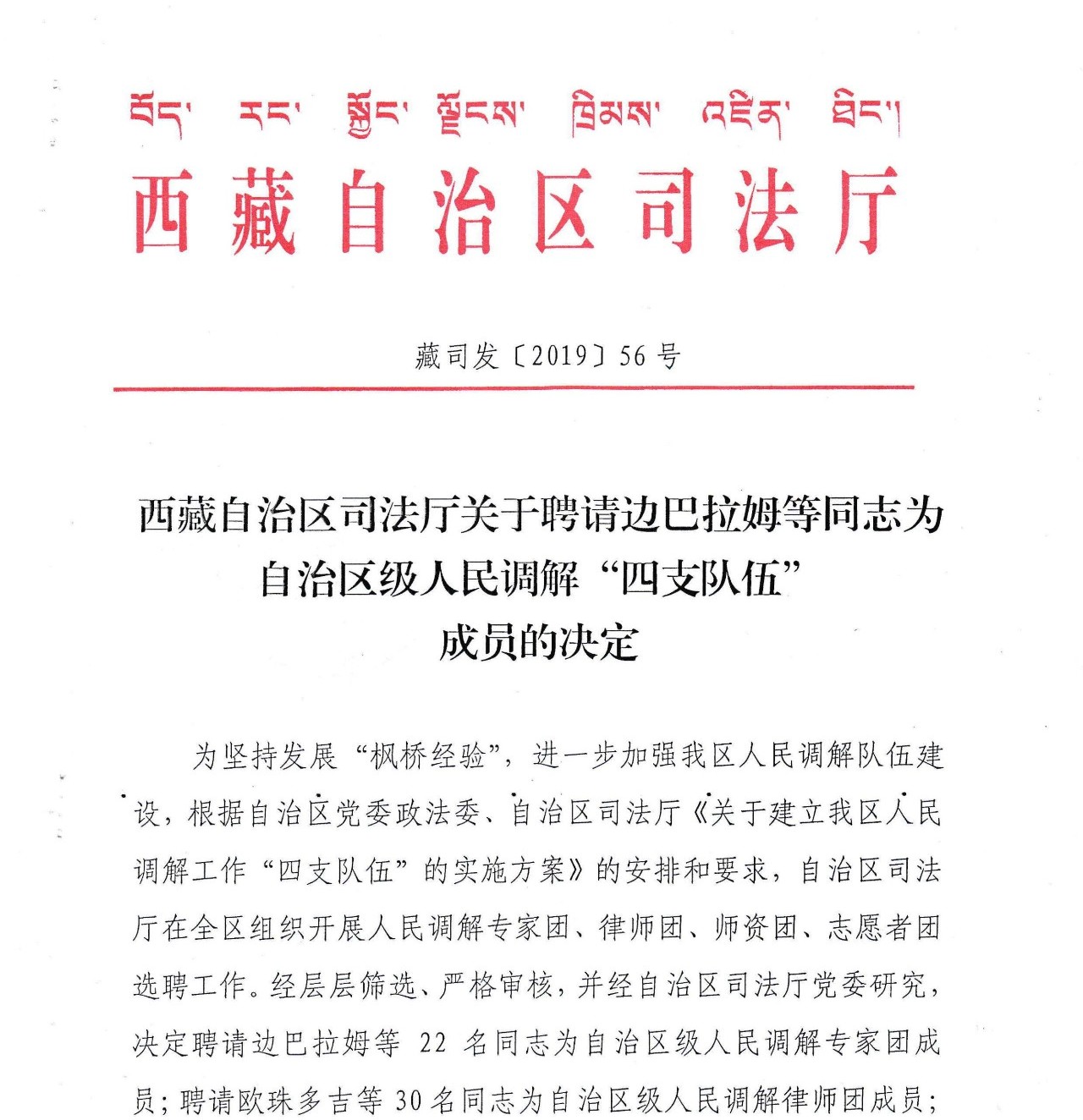 西藏自治区司法厅关于聘请边巴拉姆等同志为自治区级人民调解“四支队伍” 成员的决定