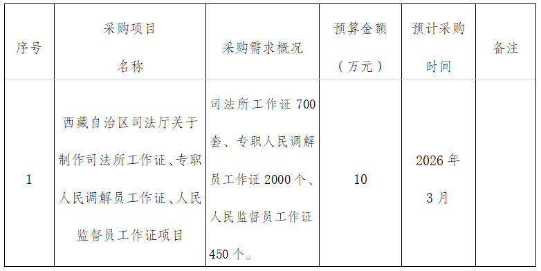 为便于供应商及时了解政府采购信息,根据《财政部关于开展政府采购意向公开工作的通知》(财库〔2020〕10号)和《西藏自治区财政厅关于政府采购意向公开工作的通知》(藏财采办〔2020〕140号)及《西藏自治区司法厅机关采购管理办法》(藏司发〔2025〕67号)等有关规定,现将西藏自治区司法厅关于制作司法所工作证、专职人民调解员工作证、人民监督员工作证项目公开采购意向如下: