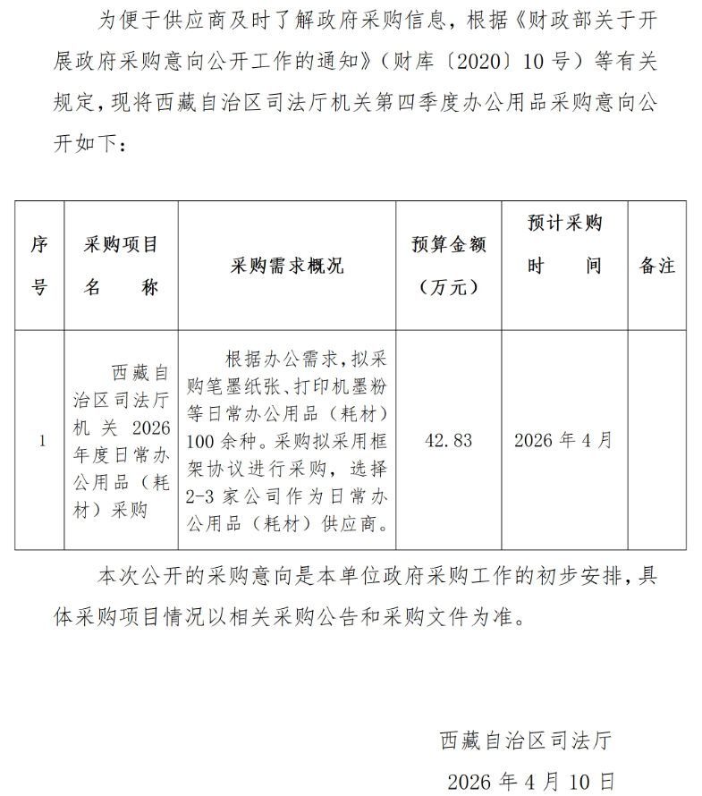 西藏自治区司法厅机关 2026年办公用品采购项目采购意向公告