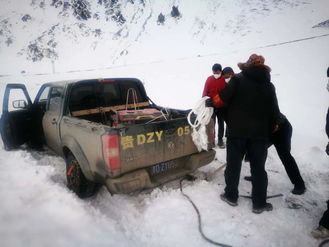 由于康庆拉山前日连降大雪,盘山公路积雪积冰严重,加之山路狭窄弯多路险,山上寒风呼啸,山路崎岖,只见在冰雪的路面上,救援人员有时前拉后推,有时铲冰除雪,有时车拉人推,艰难抵达车辆被困地点。