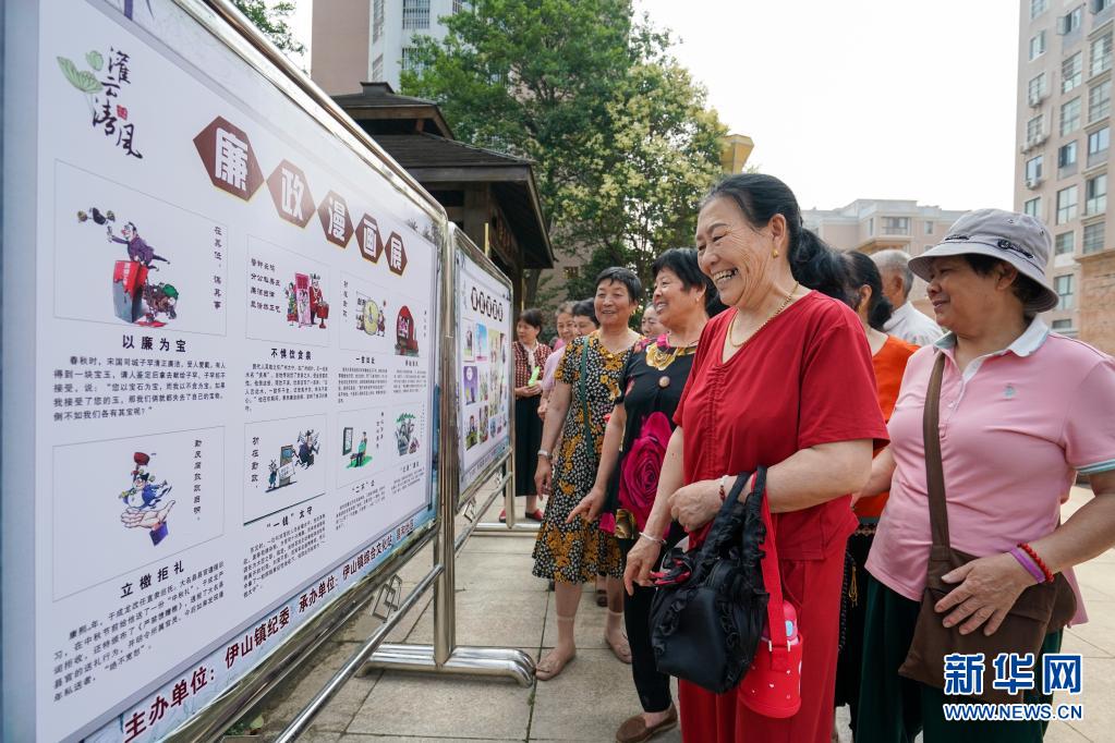 6月23日,在江苏省连云港市灌云县昌和社区“廉政文化进社区”活动现场,社区居民在参观廉政漫画展。新华社记者李博摄