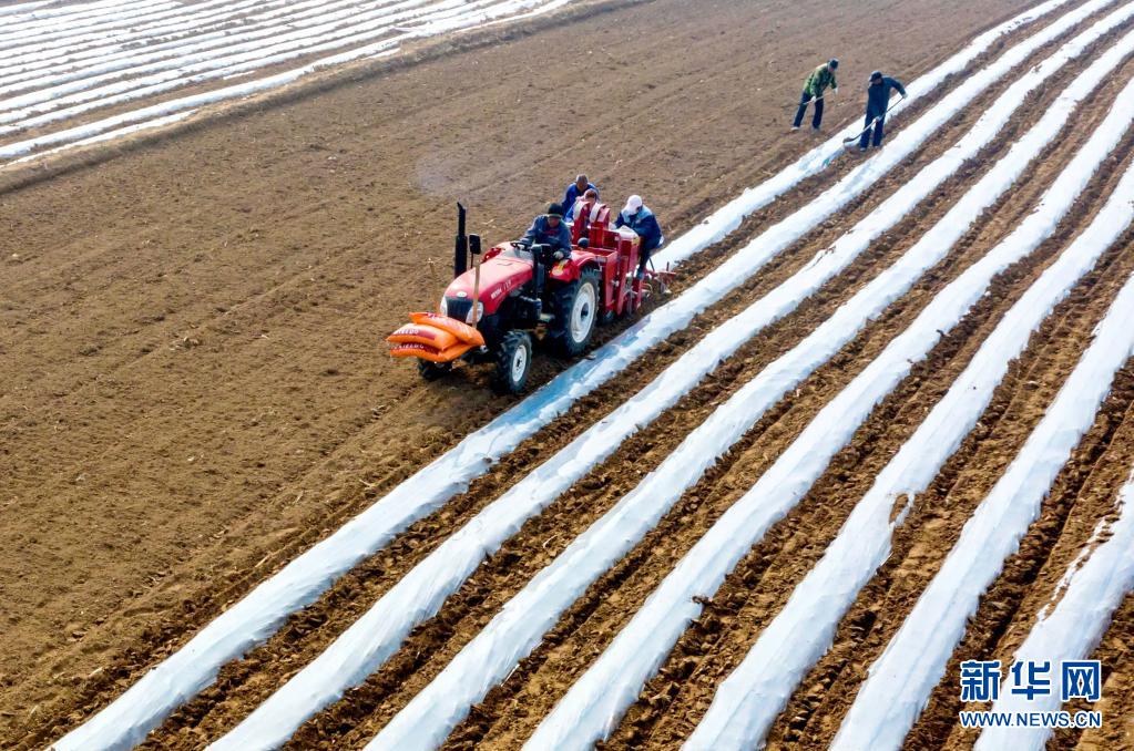 3月9日,河北省武安市淑村镇白沙村村民在播种土豆(无人机照片)。新华社记者 王晓 摄