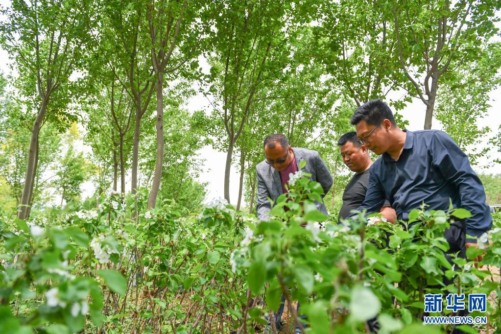 5月20日,吉林省四平市铁东区叶赫满族镇英额堡村党总支书记胡成君(左一)、驻村第一书记马全(右一)和驻村工作队队员查看村中果树种植情况。新华社记者 张楠 摄