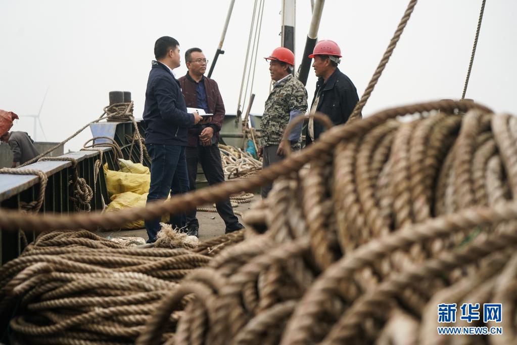 2020年10月21日,江苏省海安市滨海新区纪工委干部(左一、左二)向渔船负责人询问惠渔油补发放情况。新华社记者 季春鹏 摄