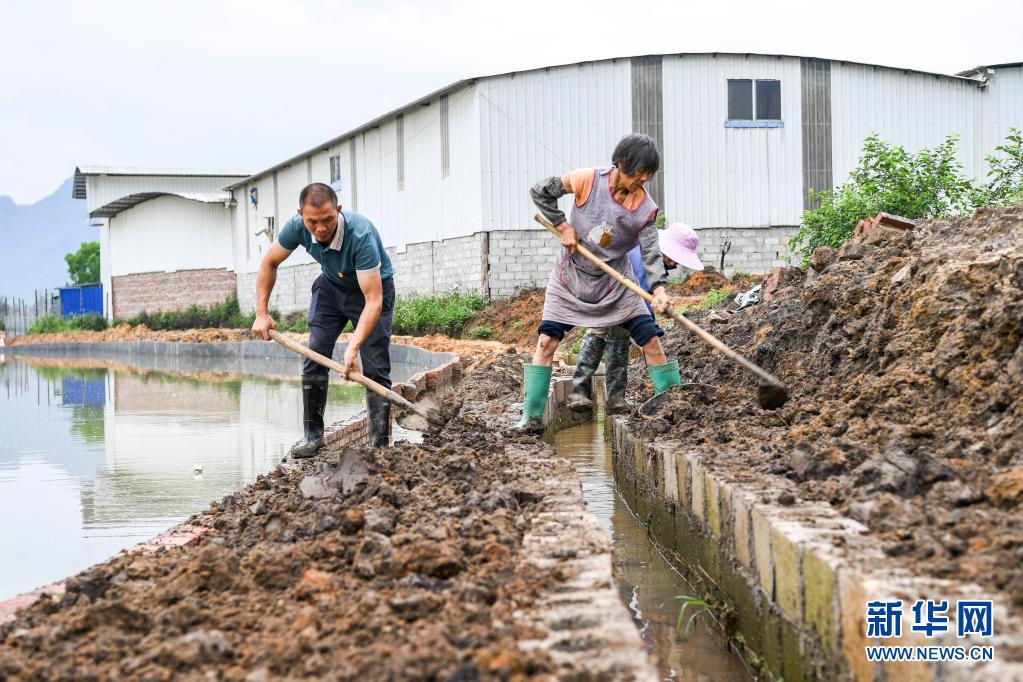 5月15日,广西贺州市钟山县公安镇廖屋村党总支书记、村委会主任廖其智(左一)与村民一起修理鱼塘。新华社记者 曹祎铭 摄