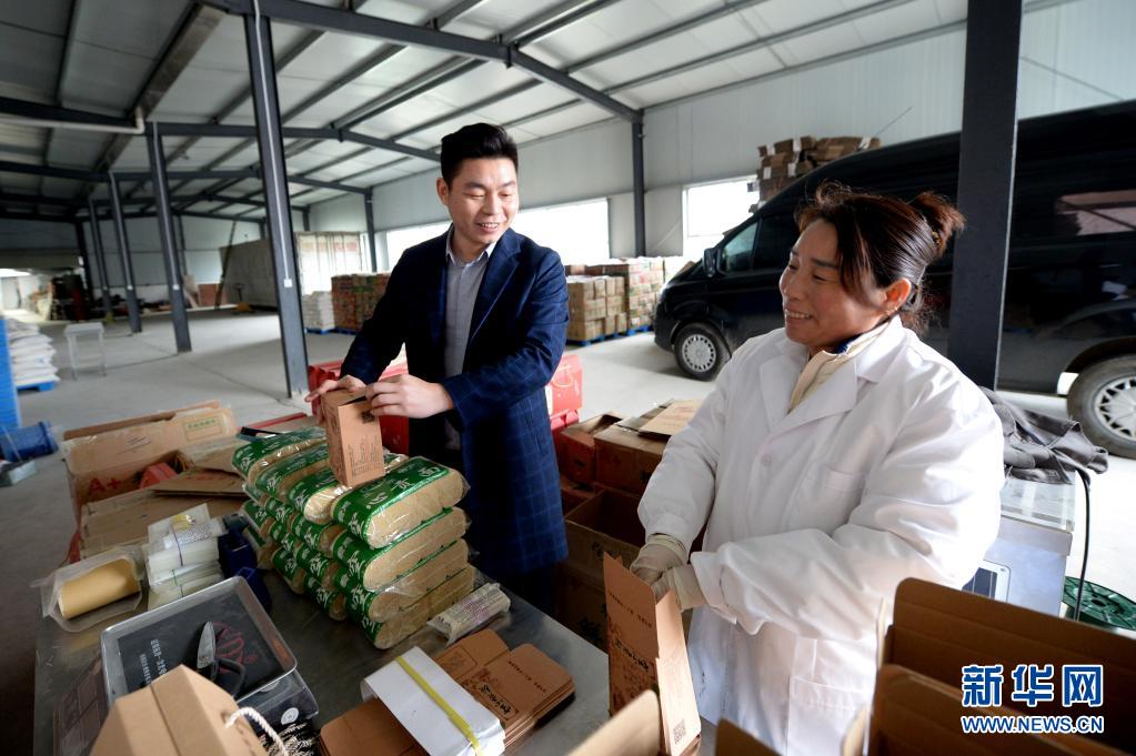 在河南省信阳市潢川县付店镇刘楼村,村党支部书记胡晓柱(左)与一位空心贡面生产工人交流(3月18日摄)。新华社记者 冯大鹏 摄