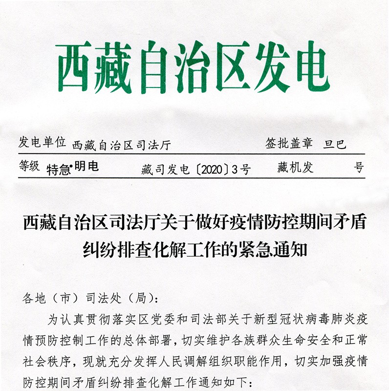 西藏自治区司法厅印发通知,安排部署疫情防控期间矛盾纠纷排查化解工作